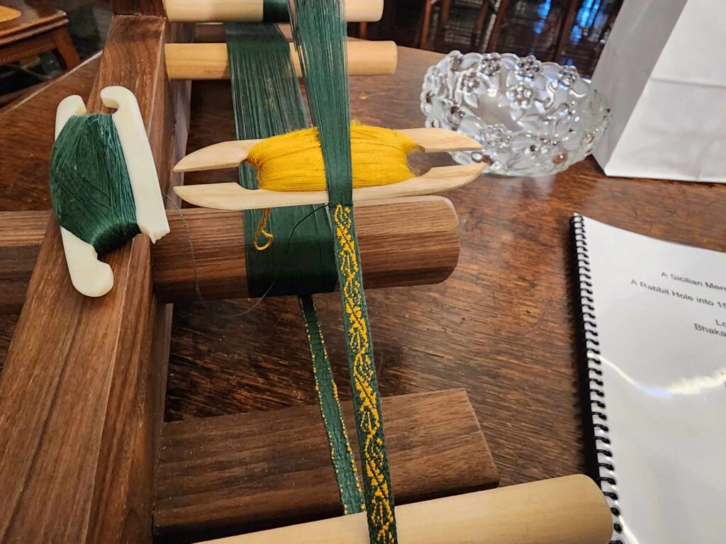 Two pairs of tablet woven garters. Silk on the left, Cotton on the right.Fingerloop braided favors. (My very first ones). These are a matched pair in my colors, the silver one I adorned on my boyfriend’s wrist the day I made it. A yard of Tablet Woven Brocade trim, entered into the A&S championship at Bhakail Yule 2023